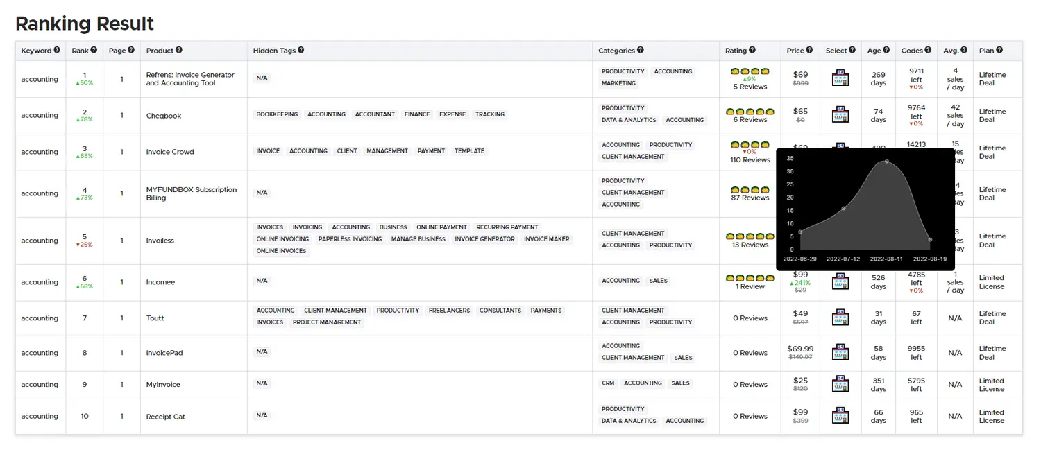 In just few seconds, you will automatically have access to the competitive landscape to help improve your AppSumo listing faster. As result, it will increase your potential of sales & ROI on AppSumo, helping you reach your goal in a fraction of the time, without breaking the bank.